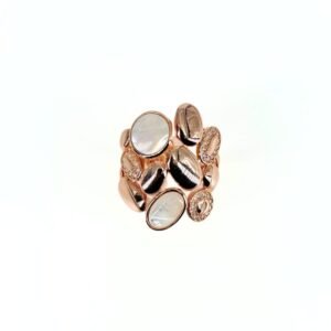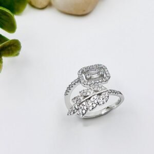The Ring Features A Complex, Three-Dimensional Design Reminiscent Of Intertwining Ribbons Or Waves. The Surface Of The Ring Is Entirely Covered With What Seems To Be Small Diamonds Or Cubic Zirconia, Giving It A Brilliant, Sparkling Appearance. The Ring’S Design Is Asymmetrical And Fluid, With Multiple Curved Bands That Overlap And Weave Around Each Other, Creating A Dynamic And Eye-Catching Effect. The Cubic Zirconia Creates A Continuous Sparkle Effect, Adding To The Ring’S Luxurious Appeal.