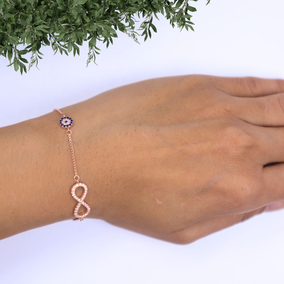 The bracelet showcases an infinity symbol charm, which is embellished with small, clear cubic zirconia, adding a touch of sparkle. Adjacent to the infinity symbol is a smaller, circular charm featuring an “evil eye” design, with a deep blue center and surrounding cubic zirconia, adding a protective and cultural element to the piece. The combination of the infinity symbol and the evil eye charm makes this bracelet a meaningful and stylish accessory.