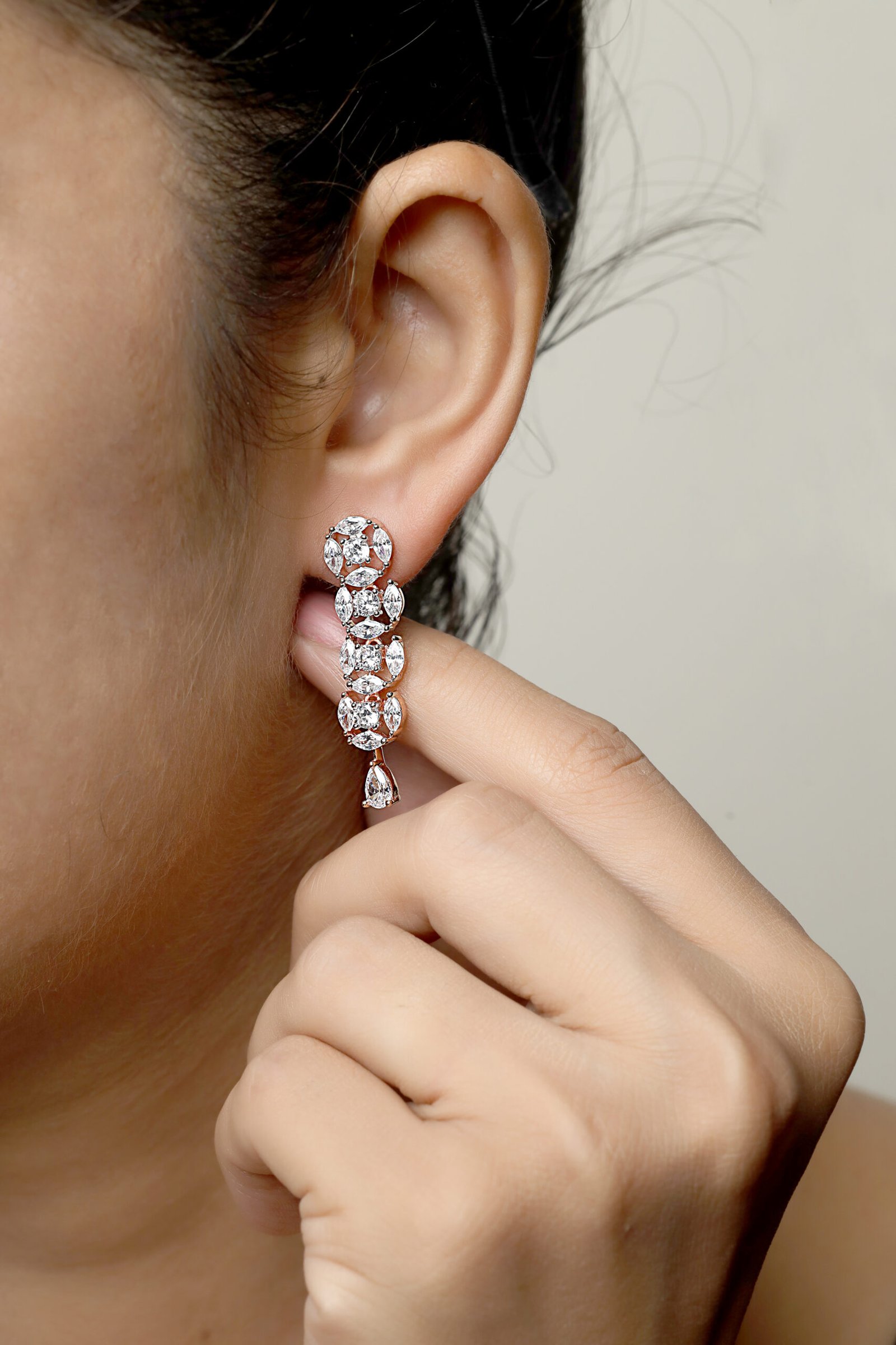 The necklace features a stunning array of pear-shaped Cubic Zirconia, meticulously placed to create a harmonious pattern. Each teardrop-shaped Zirconia is complemented by delicate round-cut accents, forming a subtle yet captivating fringe design. The rose gold polish adds a soft, warm glow, enhancing the brilliance of the Zirconia. This versatile necklace combines classic sophistication.
