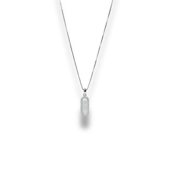 This Sophisticated Cylinder Shape Pendant Combines Classic Elegance With Contemporary Design, Crafted From High-Quality Sterling Silver. The Pendant Features A Sleek, Cylindrical Shape That Adds A Modern Touch To Its Timeless Design. At The Heart Of The Pendant Is A Stunning Mother Of Pearl Inlay. The Mother Of Pearl Is Beautifully Set In The Center Of The Cylinder, Showcasing Its Iridescent, Lustrous Surface. The Border Line Of The Cylinder Is Meticulously Adorned With A Series Of Small, High-Quality Zirconia Stones. The Zirconia Adds A Touch Of Sparkle And Luxury, Creating A Striking Contrast With The Smooth, Luminous Mother Of Pearl Center.